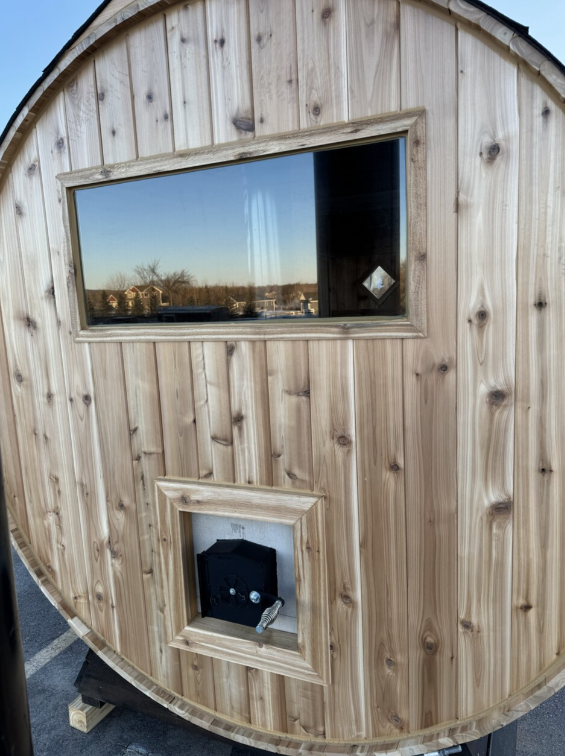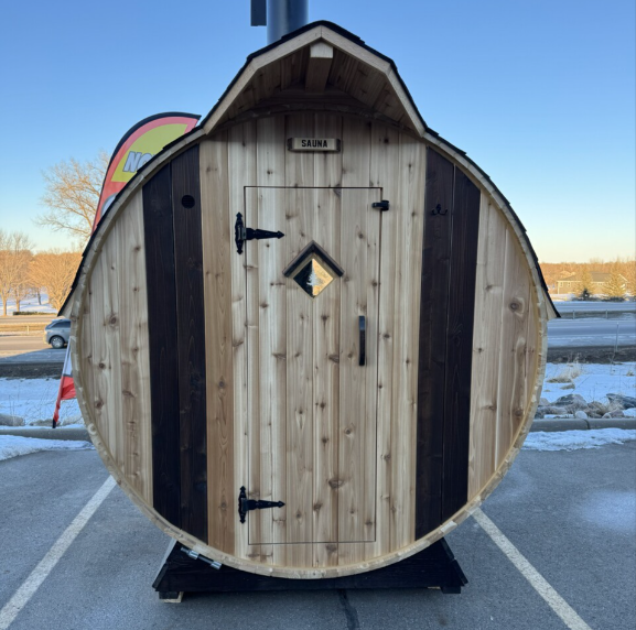 This Setri 7×6 8-Person Western Red Cedar Barrel Sauna is fully assembled and available now, featuring a traditional Setri wood sauna stove for an authentic, wood-fired sauna experience.